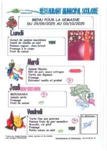 BUIRE : Menus du restaurant scolaire, semaine du 29 septembre au 3 octobre. Publié le 28/09/2025 par admin3018 Le menu du restaurant scolaire de cette semaine (29 septembre au 3 octobre) est le suivant : MENU-SEMAINE-40.2025