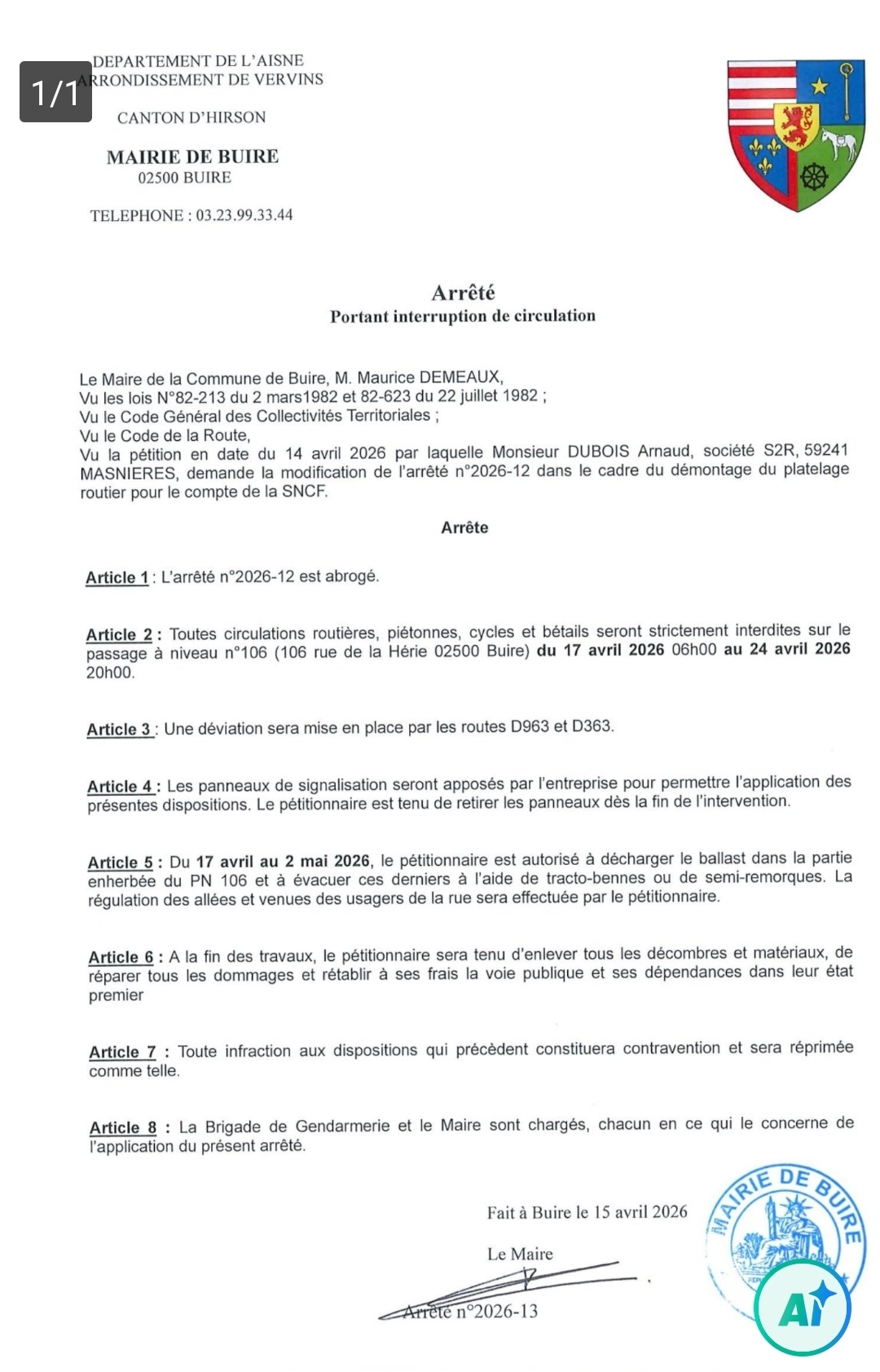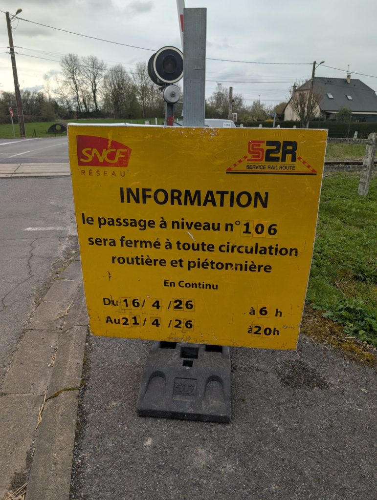 Des travaux vont être effectués au PN106 à partir du 16/04 jusqu’au 21/04. Ci-joints l’arrêté, la déviation et la photo de la signalisation routière.